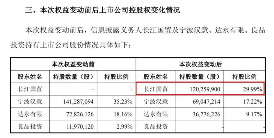 本次权益变动后,长江国贸将直接持有良品铺子1.2亿股股份及对应的表决权,占良品铺子总股本的29.99%,成为公司控股股东。