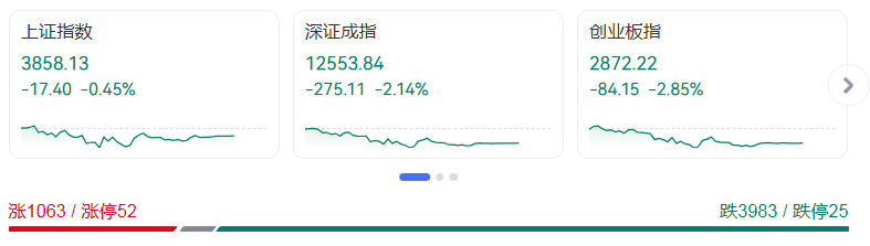 9月2日,A股市场三大指数集体呈现回调态势。截至收盘,沪指下跌0.45%,收报3858.13点;深证成指跌幅达2.14%,收报12553.84点;创业板指表现更为低迷,下跌2.85%,收报2872.22点。沪深两市今日成交额显著放大,达到28750亿,较昨日放量1250亿,显示市场多空双方博弈激烈。