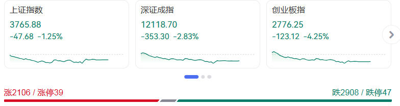 今日(9月4日),A股市场呈现出三大指数集体回调的态势。截至收盘,沪指表现相对平稳,却仍跌1.25%,收报3765.88点;深证成指跌势较为明显,跌幅达2.83%,收报12118.70点;而创业板指回调幅度最大,下跌4.25%,收报2776.25点。沪深两市成交额显著放大,达到25443亿,较昨日放量1802亿,显示出市场活跃度较高,多空双方博弈激烈。