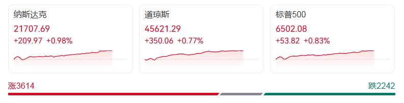 收盘时,标普500指数涨幅达0.83%,稳稳站在6502.08点,成功刷新了上周四刚刚录得的收盘纪录,这也是该指数在今年内第21次收于新高。道琼斯指数当日涨0.77%,报45621.29点;纳斯达克综合指数表现更为强劲,涨幅为0.98%,收于21707.69点,同样在纪录高位附近徘徊。