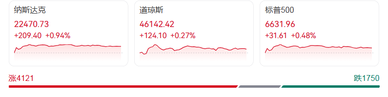 美东时间9月18日周四,美股三大指数收盘齐创新高,美联储降息利好提振了投资者信心,英伟达入股英特尔引发芯片股狂欢。截至收盘,道指涨124.10点,涨幅为0.27%,报46142.42点;纳指涨209.40点,涨幅为0.94%,报22470.73点;标普500指数涨31.61点,涨幅为0.48%,报6631.96点。