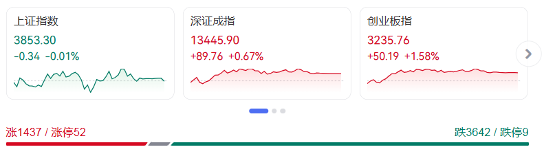 9月25日,A股市场延续分化格局,三大指数走势迥异但成交额持续放量,结构性机会集中于科技成长领域。截至收盘,上证指数微跌0.01%报3853.30点,盘中在3840.46点至3866.11点区间窄幅震荡;深证成指上涨0.67%收于13445.90点,创业板指表现强势,大涨1.58%站稳3235.76点,日内最高触及3266.00点。沪深两市成交额达23711亿元,较前一交易日增加443亿元,显示市场交投活跃度持续提升。
