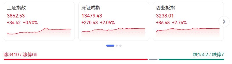 截至收盘,上证指数上涨0.90%,收报3862.53点;深证成指涨幅达2.05%,收于13479.43点;创业板指表现尤为强劲,大涨2.74%,收报3238.01点。