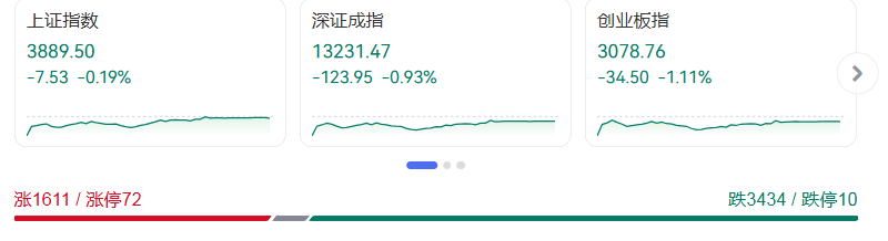 10月13日A股市场呈现震荡调整态势,三大指数集体收跌但盘中展现回升韧性。截至收盘,上证指数报3889.50点,下跌0.19%;深证成指跌至13231.47点,跌幅0.93%;创业板指表现偏弱,收于3078.76点,下跌1.11%。两市成交额达23548亿元,较前一交易日缩量1609亿元,显示市场观望情绪升温。