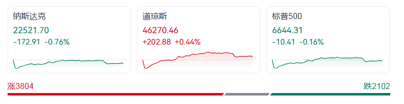美东时间10月14日周二,美股三大股指收盘涨跌互现,市场在银行财报利好与贸易不确定性中震荡。截至收盘,道琼斯工业平均指数涨202.88点,涨幅0.44%,报46270.46点;纳斯达克综合指数跌172.91点,跌幅0.76%,报22521.70点;标普500指数跌10.41点,跌幅0.16%,报6644.31点。