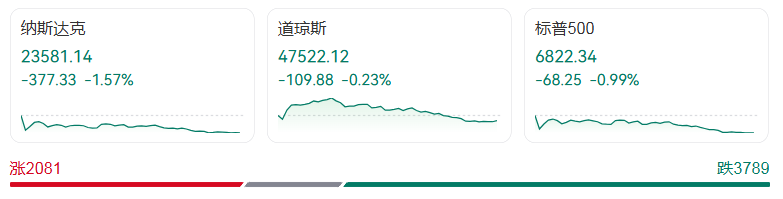 美东时间10月30日周四,美股市场结束此前的上涨态势,三大指数集体收跌。截至收盘,道琼斯工业平均指数下跌0.23%,报47522.12点;标普500指数跌幅扩大至0.99%,收于6822.34点;纳斯达克综合指数重挫1.57%,报23581.14点,终结了近期连创新高的强劲势头。