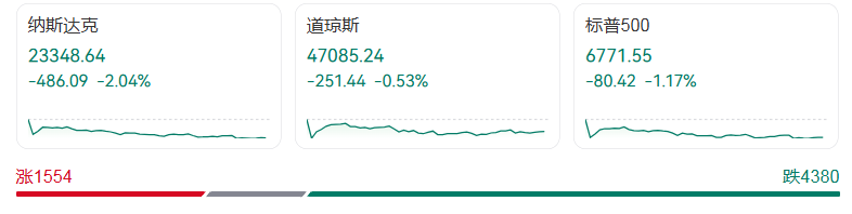 美东时间11月4日周二,美股市场迎来显著调整,三大指数集体收跌,高估值引发的抛售压力集中释放。截至收盘,纳斯达克综合指数跌幅居前,下跌2.04%报23348.64点;标准普尔500指数跌1.17%,收于6771.55点;道琼斯工业平均指数相对抗跌,微跌0.53%报47085.24点。