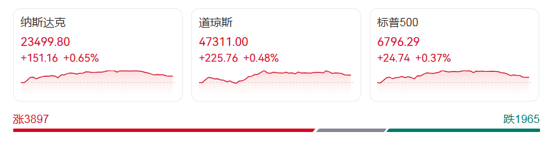 截至收盘,标普500指数上涨0.37%,报6796.29点;纳斯达克综合指数涨0.65%,收于23499.8点;道琼斯工业平均指数上涨0.48%,报47311点。尽管指数普涨,但市场分化特征显著,标普500指数今年已创下36次历史新高,最近一次为10月28日,不过自2025年初以来,该指数约一半涨幅由6只股票贡献,涨势广度持续狭窄。