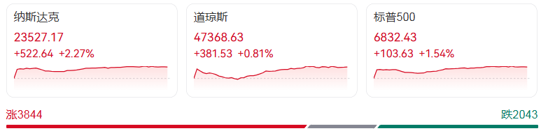 美东时间11月10日周一,美股三大指数集体放量收涨,市场风险偏好显著回升。截至收盘,道琼斯工业平均指数上涨381.53点,涨幅0.81%,报47368.63点;纳斯达克综合指数大涨522.64点,涨幅2.27%,报23527.17点;标普500指数上涨103.63点,涨幅1.54%,报6832.43点。