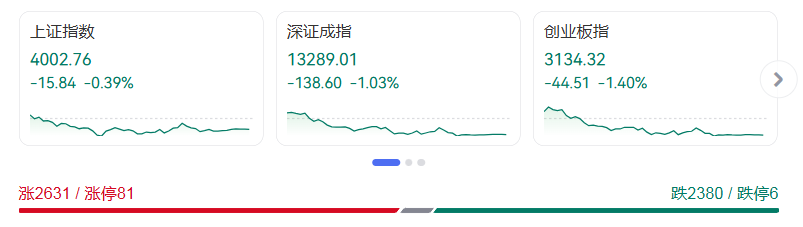 11月11日,A股三大指数集体回调,上证指数在4000点关口展开激烈拉锯,最终险守关键点位。截至收盘,沪指微跌0.39%报4002.76点,深证成指与创业板指跌幅扩大,分别下跌1.03%、1.40%,收于13289.01点和3134.32点。市场交投活跃度有所降温,沪深两市成交额19936亿元,较前一交易日缩量1809亿元,反映出投资者在关键点位前的谨慎心态。