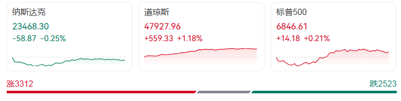 截至收盘,道指大涨559.33点,涨幅1.18%,报47927.96点;标普500指数微涨14.18点,涨幅0.21%,报6846.61点;纳指则下跌58.87点,跌幅0.25%,报23468.30点。板块方面,标普500指数11个板块呈现“10涨1跌”态势,医疗保健板块领涨2.33%,能源、日用消费品等板块涨幅均超1%,仅信息技术/科技板块逆市下跌0.72%。