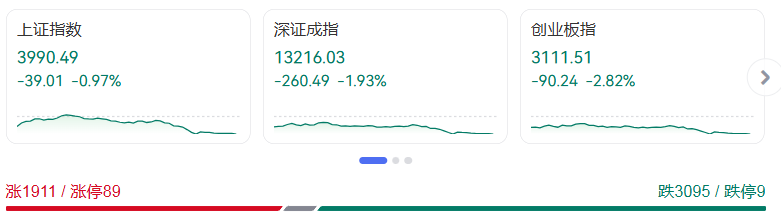 11月14日,A股市场呈现震荡调整态势,三大指数同步收跌,其中创业板指跌幅接近3%,市场热点分化明显,存量博弈特征凸显。截至收盘,沪指报3990.49点,下跌0.97%;深证成指报13216.03点,下跌1.93%;创业板指报3111.51点,下跌2.82%,创近期调整幅度新高。