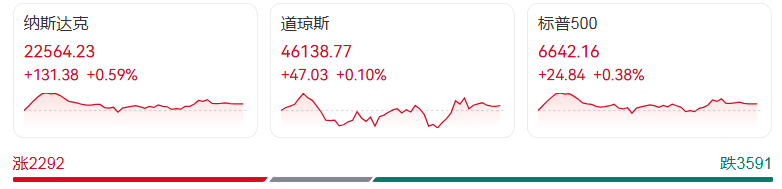 美东时间11月19日周三,美股在连续多日调整后迎来反弹,三大指数集体收涨。截至收盘,道琼斯工业平均指数上涨47.03点,涨幅0.10%,报46138.77点;标普500指数上涨24.86点,涨幅0.38%,报6642.18点;纳斯达克综合指数表现最为强劲,上涨131.38点,涨幅0.59%,报22564.23点。