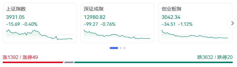 11月20日A股市场呈现震荡回调态势,三大指数同步收跌,板块分化格局显著。截至收盘,上证指数下跌0.40%报3931.05点,深证成指跌0.76%收12980.82点,创业板指跌幅达1.12%,报3042.34点。沪深两市成交额17082亿元,较前一交易日小幅缩量177亿元,显示市场观望情绪升温。