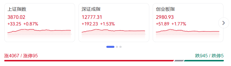 11月25日A股市场呈现全面反攻态势,三大指数同步走强,两市成交额时隔多日重返1.8万亿关口,市场做多情绪显著升温。截至收盘,上证指数上涨0.87%,收报3870.02点;深证成指涨幅1.53%,收报12777.31点;创业板指表现尤为强势,上涨1.77%至2980.93点,逼近3000点整数关口。