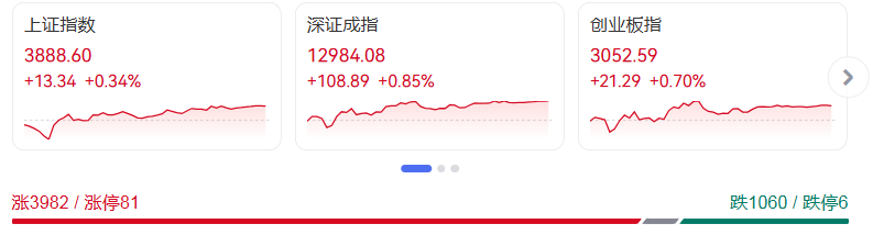 11月28日A股市场呈现“指数温和上涨、个股多点开花”的格局,三大核心指数同步收红,行业板块普涨态势显著,但成交额同比萎缩引发市场对后续动能的关注。截至收盘,上证指数上涨0.34%,报收3888.60点;深证成指涨幅0.85%,收于12984.08点;创业板指上涨0.70%,站稳3050点关口,报3052.59点。
