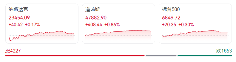 截至收盘,道琼斯工业平均指数上涨408.44点,涨幅0.86%,报47882.90点;纳斯达克综合指数微涨0.17%,收于23454.09点;标普500指数上涨0.30%,报6849.72点,距10月29日创下的6920点历史高位仅一步之遥。