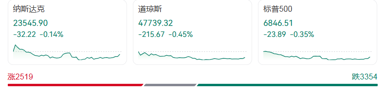 美东时间12月11日周一,美股三大股指集体收跌,市场目光聚焦于本周稍晚举行的美联储年内最后一次货币政策会议。截至收盘,道指跌215.67点,跌幅0.45%,报47739.32点;纳指跌32.22点,跌幅0.14%,报23545.90点;标普500指数跌23.89点,跌幅0.35%,报6846.51点。