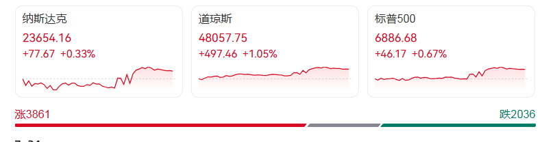 美东时间12月10日周三,美股市场尾盘发力大幅反弹,三大指数集体收涨,标普500指数逼近10月创下的历史新高。截至收盘,道指上涨497.46点,涨幅1.05%,报48057.75点;纳指涨77.67点,涨幅0.33%,报23654.16点;标普500指数涨46.17点,涨幅0.67%,报6886.68点。