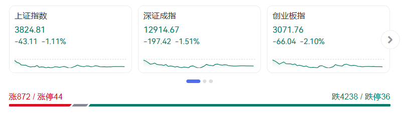 指数表现方面,截至收盘,上证指数下跌1.11%,收报3824.81点;深证成指跌幅扩大至1.51%,收报12914.67点;创业板指走势最弱,下跌2.10%,收报3071.76点。成交额层面,沪深两市合计成交17242亿元,较昨日缩量493亿元,显示市场交投活跃度略有降温,资金观望情绪有所上升。