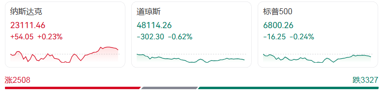 截至收盘,主要指数表现分化:道琼斯工业平均指数下跌0.62%,报收48114.26点;标普500指数下跌0.24%,收于6800.26点,延续近期下行态势;纳斯达克综合指数逆势上涨0.23%,报23111.46点。