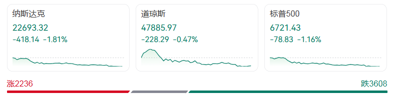 截至收盘,道琼斯工业平均指数下跌0.47%,报47,885.97点;标普500指数跌1.16%,收于6,721.43点;以科技股为主的纳斯达克综合指数跌幅最深,达1.81%,报22,693.32点。