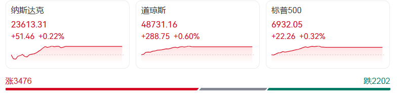 截至收盘,道琼斯指数上涨0.6%,报48731.16点,超越12月11日创下的前期高点;标普500指数上涨0.32%,收于6932.05点,连续第二个交易日创收盘新高,盘中更触及6937.32点的历史峰值;纳斯达克综合指数上涨0.22%,报23613.31点,持续稳居高位。