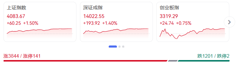 截至收盘,三大指数集体收涨,其中沪指上涨1.50%,收报4083.67点;深证成指上涨1.40%,收报14022.55点;创业板指上涨0.75%,收报3319.29点。沪深两市成交额高达28326亿元,较前一交易日放量2651亿元,增量资金入场迹象明显。