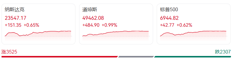 截至收盘,道指上涨484.90点,涨幅0.99%,报收49462.08点;纳斯达克综合指数上涨151.35点,涨幅0.65%,报收23547.17点;标普500指数上涨42.77点,涨幅0.62%,报收6944.82点,三大指数连续多个交易日保持上涨势头。