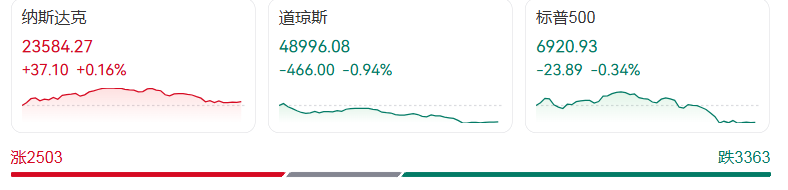 截至收盘,主要股指表现分化明显:道指下跌466.00点,跌幅0.94%,报收48996.08点;标普500指数下跌23.89点,跌幅0.34%,报收6920.93点;纳指逆势上涨37.10点,涨幅0.16%,报收23584.27点。市场分化背后,板块表现呈现鲜明反差,金融股成为主要拖累,而AI相关科技股则吸引资金回流。
